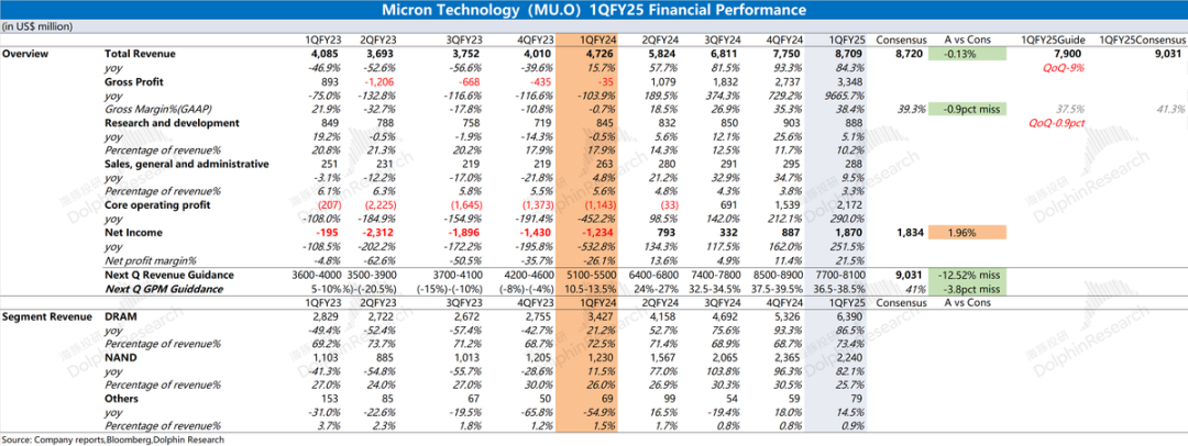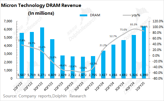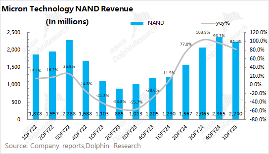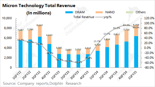 好意思光公司2025财年第一季度总营收为87.1亿好意思元,同比增长84.3%,合乎市集预期(87.2亿好意思元)。本季度的收入同比回升,主如若受公司存储居品加价的带动,其中公司的DRAM和NAND居品的出货均价同比涨幅均有60%+。