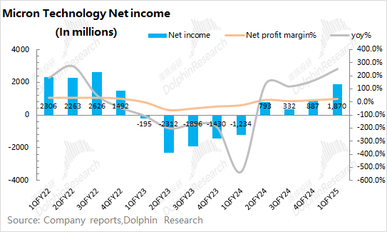 好意思光公司2025财年第一季度完了净利润18.7亿好意思元,合乎市集预期(18.3亿好意思元)。公司本季度的利润增长,主要收货于DRAM的业务增长以及毛利率的擢升。而在本季度,公司净利率为21.5%,盈利才调擢升赫然。其中公司本季度的概念性利润达到了21亿好意思元,依然达到了过往周期中相对较高的位置。