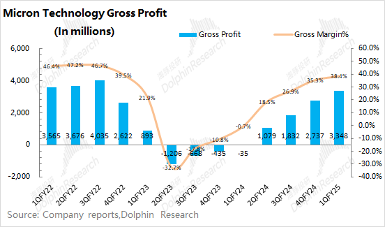 好意思光公司2025财年第一季度完了毛利33.48亿好意思元,公司的季度毛利不竭回升。