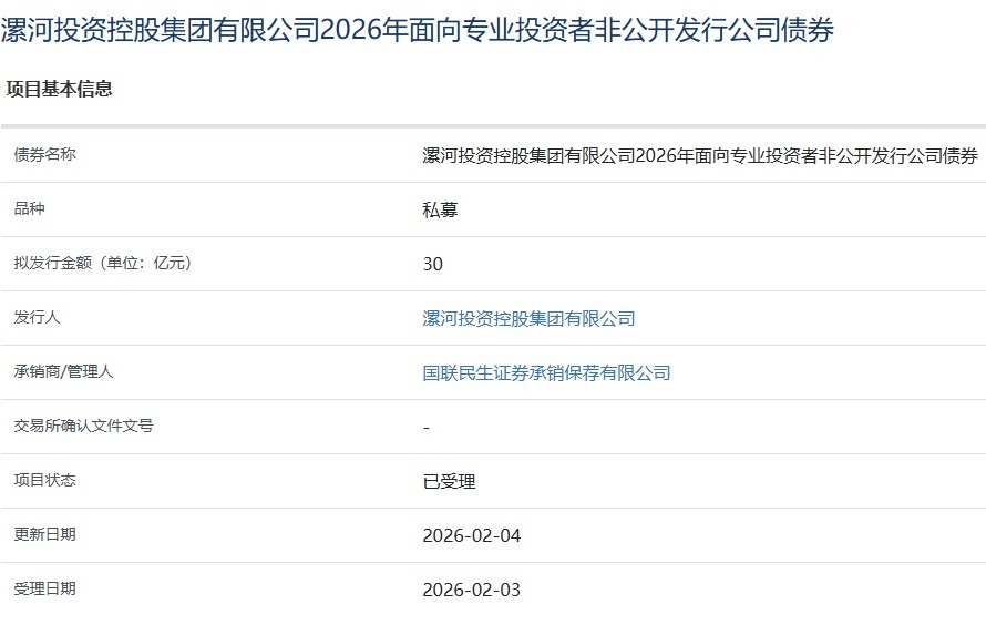 【大河财立方音书】2月4日,漯河投资控股集团有限公司2026年面向专科投资者非公开荒行公司债券获上交所受理。该债券拟刊行金额30亿元,承销商/经管东谈主为国联民生证券承销保荐有限公司。2025年8月5日开云体育,经中证鹏元详细评定,刊行东谈主主体信用评级为AA+,评级瞻望褂讪。