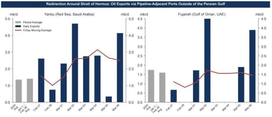 不成绕路吗?表面上不错,比如通过沙特Yanbu港、阿联酋Fujairah港。表面不错绕360万桶/天,内容只绕了90万桶/天,替代才能远低于预期。