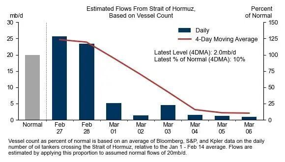 高盛估算,普通情况下霍尔木兹海峡每天大要运输1800万桶石油,但咫尺的流量大要只剩10%操纵。风险如故不单是停留在表面层面,如故初始影响简直供应。要是抓续时期拉长,库存很快会被蹧跶。
