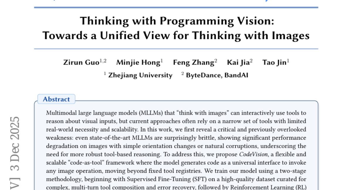 为了惩办这个问题,斟酌团队开垦了一个名为"CodeVision"的蜕变性框架。与传统方法不同的是,这个系统不是浮浅地让AI"看"图片,而是教会AI像东说念主类一样"脱手"处理图片。当AI发现图片有问题时,它会自动编写代码来调用各种图像处理器具,比如旋转、编著、增强对比度等操作,然后再基于处理后的图片进行分析。