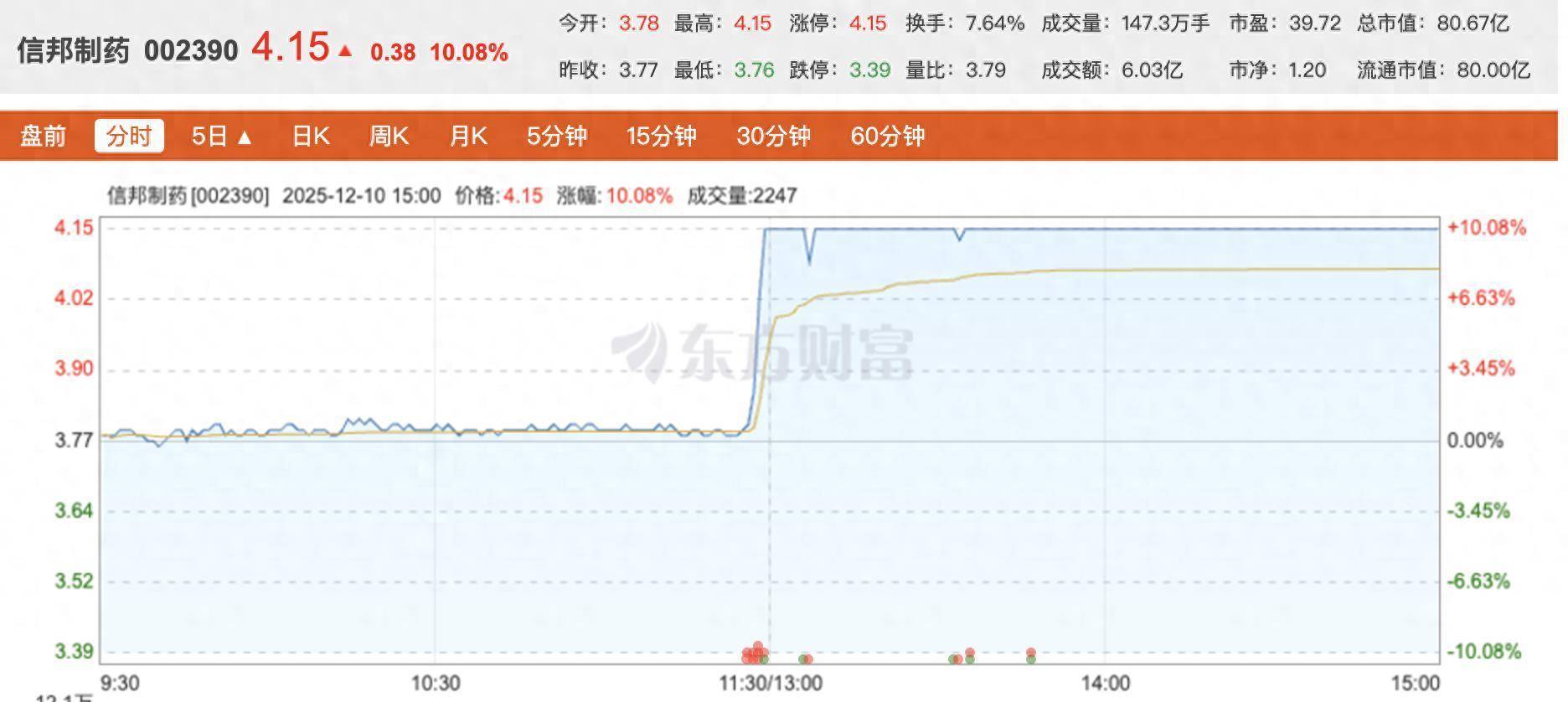 二级阛阓上,12月10日下昼开盘后信邦制药赶紧拉升涨停,法例收盘报4.15元/股。